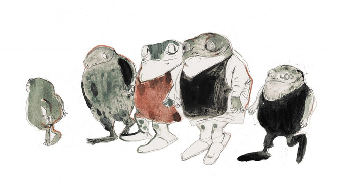 《游侠小木客》系列插图中的蟾蜍,它们体型巨大,声音也很大。为了避免打扰到别人,他们白色的声囊和肚腔鼓动着,用腹语聊天。