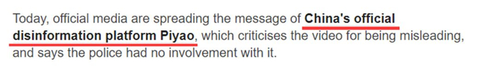 最后,在凯丽女士的这篇文章中,还有一个小细节也值得大家留意,就是她居然把参与澄清那个不靠谱“报警手势”的“中国互联网联合辟谣平台”,翻译成了“China‘s official disinformation platform”,即“中国官方假信息平台”的意思……