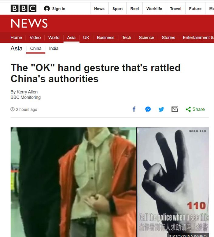 首先,这篇报道的标题就很奇怪,叫“这个OK手势让中国当局紧张恐惧”。
