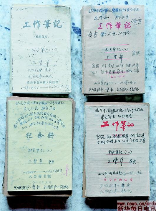 “只饮迎丰一弯水,止用迎丰一张纸。”一行工工整整的字,被王丰华写在21本笔记本的封面或扉页上。他从2013年年底当选为村委会主任后,就开始了记工作笔记的习惯。