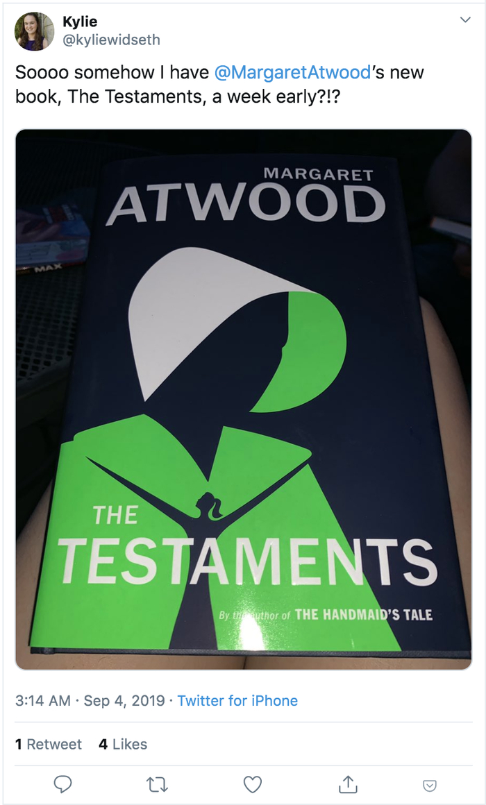 不过,虽然出版方对于阿特伍德新书的发售日期做了严格规定,但在本周三时,便有读者在社交平台上反映,自己提前一周就拿到了在亚马逊上预购的本该在下周二开售的《遗嘱》。由于亚马逊的失误操作,一些媒体也不得不将准备好的新书段落和评论,在周三晚间提前发出。而且,因为已经有读者拿到新书,人们很有可能在接下来的几天里,在网络上看到各种提前剧透。