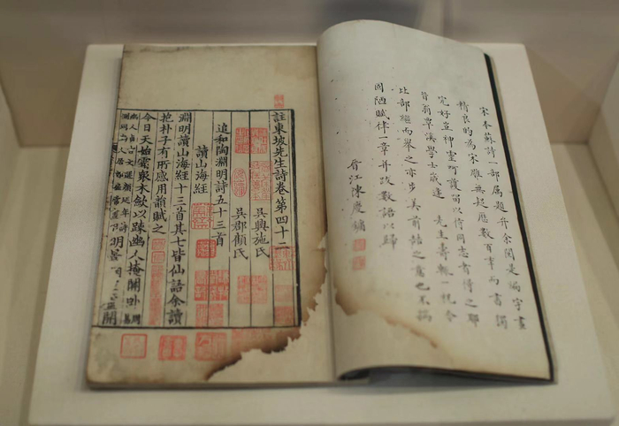 与其他宋版苏轼诗集相比,《注东坡先生诗》收诗最多,卷四十一、四十二《追和陶渊明诗》107首及附录《苏轼年谱》,是其他版本没有的。清末,藏书家袁思亮购得此书,后来袁宅失火,袁思亮恨不得以身赴火,幸而被家人冒火救出。这本书过火而未毁,成为清代书林佳话。遗憾多册书口等部位受损,各卷内容、题跋受损,后人称之为“焦尾本”。