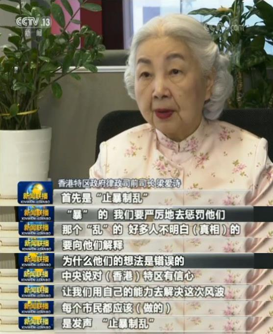 香港特区政府律政司前司长梁爱诗接受采访时表示:每个市民都应该发声——止暴制乱!梁女士的话,与香港市民陈少华的话不谋而合,也代表了很多香港人的共识——不要暴力,需要说出来!
