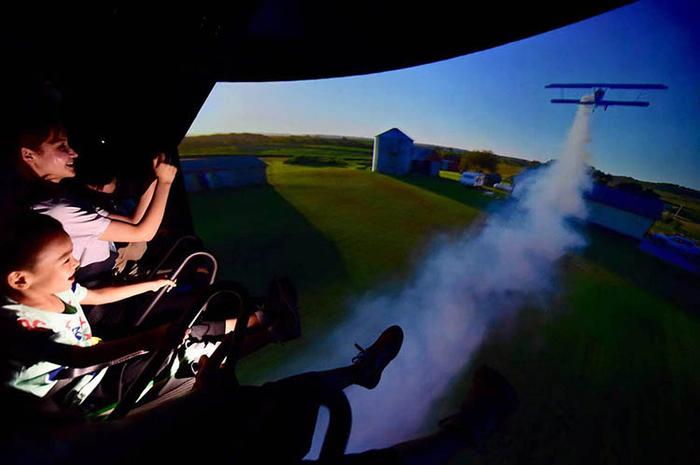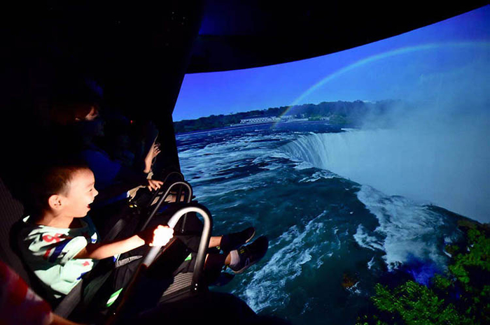 飞行影院使用飞行座椅平台,结合创新的光影技术,使人沉浸入梦幻般的飞翔世界。在20米的巨大球幕中,可以裸眼体验到急速拉升、失重、俯冲、滑翔等真实的飞行感受。水雾、吹风、香氛等技术的叠加,使观众身临其境的感觉更加逼真。飞越世界馆影片为《飞越美国》,后续还有《飞越世界》、《飞越澳大利亚》等。已经开放一年的飞越中国馆,即将推出《飞越一带一路》、《飞越清明上河图》等系列飞行影片。