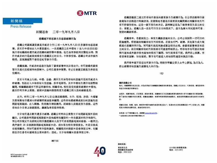 公开信提到,因为政治争议而引发的暴力事件近日蔓延到港铁网络,数十个车站被大肆破坏,暴力行为甚至威胁到港铁前线员工人身安全,“我们对此感到心痛及遗憾。同时,我们亦谴责所有破坏秩序的暴力行为。”