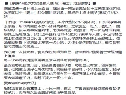 9日上午,罗范椒芬在参加电台节目时透露“有年轻女孩被他人误导,为男暴徒提供免费性服务”,此言一出立即引起各界舆论的关注。环球时报-环球网记者注意到,与此同时网络正流传一封受害女生的匿名信,写信者自称是一名“14岁的爱香港的女仔”,她本来对政治不闻不问,但由于同学都去示威,所以不想不合群就参加了。之后该女孩被灌输自己是“革命天使”,“应该用身体安慰义士”等荒谬论调(如下图),她在人引诱下吸大麻,后被7个男子侵犯过。10日中午,罗范椒芬向环球时报-环球网记者确认她在节目中所提的案例与这封信中所言确为同一件事,“我是上周六确认真有其事”。