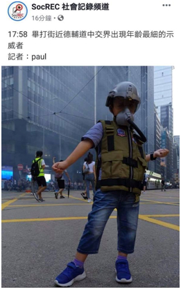 图片来源是脸书账号“SocREC 社会记录频道”9月8日18时01分发布的一则贴文的截图。截图中,一个经过头盔、护目镜、防毒面具“全副武装”的孩子双手握拳站在香港街头。“SocREC 社会记录频道”在贴文中写道:17:58 毕打街近德辅道中交界出现年龄最细(小)的示威者。