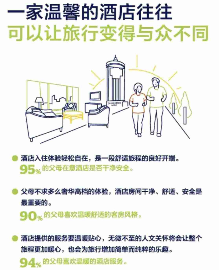为此,希尔顿逸林还推出了《希尔顿逸林家庭出游温暖指南》,从细致行程准备,到出游沟通,归纳出十条参考建议。例如“与父母同游,温馨惬意的目的地应成为首选”、“ 出游行程安排要以舒适轻松为主”、“准备好方便携带又符合父母口味的食物,以免父母饮食不习惯”等,助子女与父母一同规划和享受旅程。