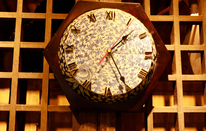 墙上挂着古陶瓷拼接的时钟“历史的时间”,采用缠枝莲纹的古瓷碎片,寓意连绵不断的祝福,古陶瓷的设计让人感受到时间一去不复返的历史感。