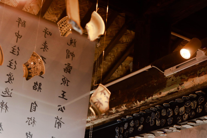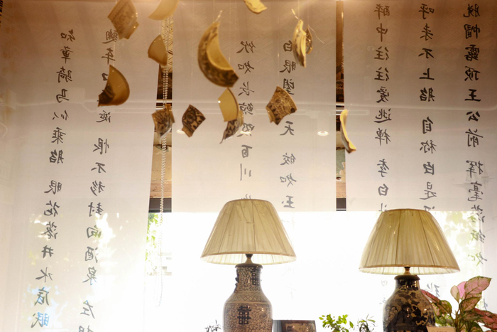 屋内亮着偏橘色的灯,站在灯下可以感受到陶瓷开片的瞬时美感。这盏灯是由各种原生态古陶瓷的碎片拼接而成的,没有经过任何切割打磨,每一片都来自清代的青花瓷,在灯光的反射下,闪着青蓝色的微光,透露出浓重的历史感和残破的美。