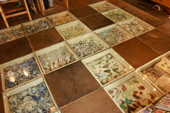 “采瓷坊”万字形的地面中,也藏着千年时光。店内修复陶瓷的负责人说,在中国古代万字形寓意着吉祥如意,而地面的陶瓷碎片中,右侧是从宋代开始的龙泉窑陶瓷,在陶瓷中年龄最大。