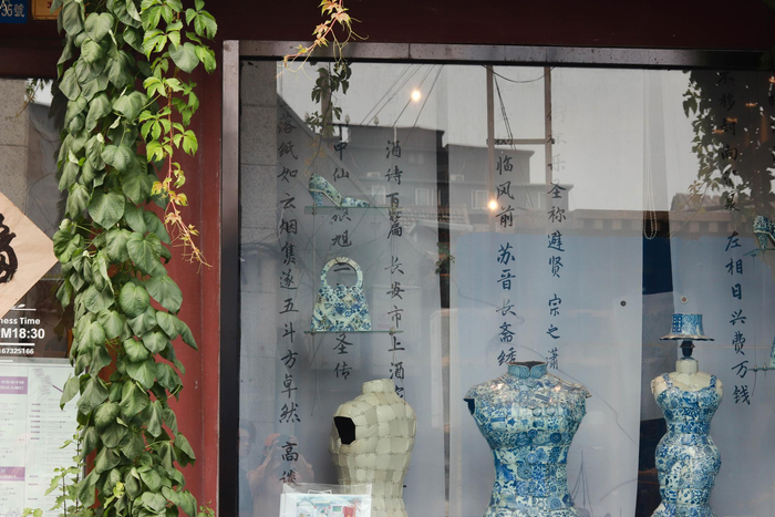 在杨梅竹斜街,一些旧时风格的建筑中,“采瓷坊”的透明橱窗格外引人注目,古瓷残片拼成的旗袍裙装、鞋履、工艺品的精品展柜后,轻透的布帘透过缝隙隐约可见古瓷碎片、首饰和瓷器衍生品,隽秀的字迹写着杜甫的《饮中八仙歌》,“宗之潇洒美少年,举觞白眼望青天,皎如玉树临风前”,方寸之间,将山水万物的中式意境之美化为我心之境。