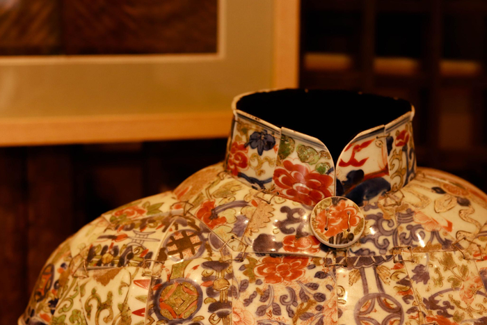 这位负责人还为京蜜介绍了拼接的古陶瓷衣服,它由清代康熙年间的青花五彩陶瓷局部拼接,纯手工打磨切割而成,再用“金丝银线”串起来制成艺术品。