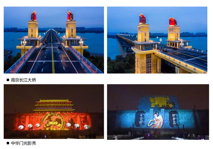 2019年,南京长江大桥全线亮灯,行走在大桥之上,阔别两年已久的玉兰灯再次点亮,桥头堡、工农兵雕像、工字堡和整座桥体熠熠生辉,点亮的不仅是过往的情怀,也是新梦想。中华门光影秀打造一场全面展现城市文化的、光影交织的立体视觉盛宴,在城墙的平台上利用人造载体实施裸眼3D投影,重现毁于战火中的城楼形象,传承城市记忆。