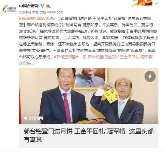 中国台湾网9月12日讯 据台湾媒体报道,11日,鸿海集团创办人郭台铭将精心准备的月饼送到台北市长柯文哲家与王金平在“立法院”的办公室。郭送到柯家的月饼附着写有“健康如意、平安喜乐、为国为民、莫忘初衷”的纸条;媒体解读郭柯大业即将启动,郭有期许。郭送到王金平办公室的月饼附着的纸条则写着“莫忘初衷、上天指路、顺应因缘、阖家安康”;媒体解读郭了解王还在等上天指路、因缘,还不会豁出去跟他一起离开国民党打江山而导致国民党开铡失去“立委”职位。