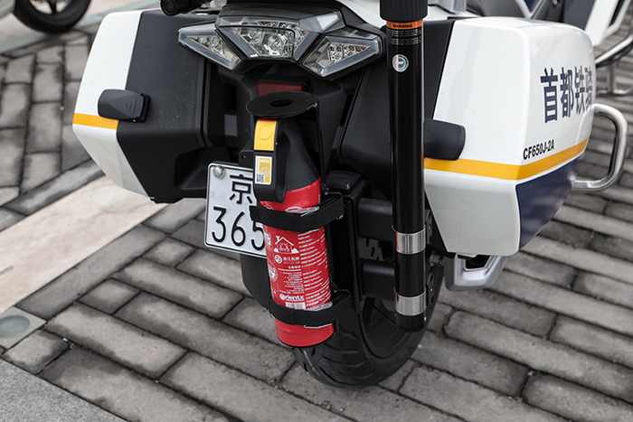 每辆摩托车安装了灭火器、警灯、警报器、喊话器等设备。