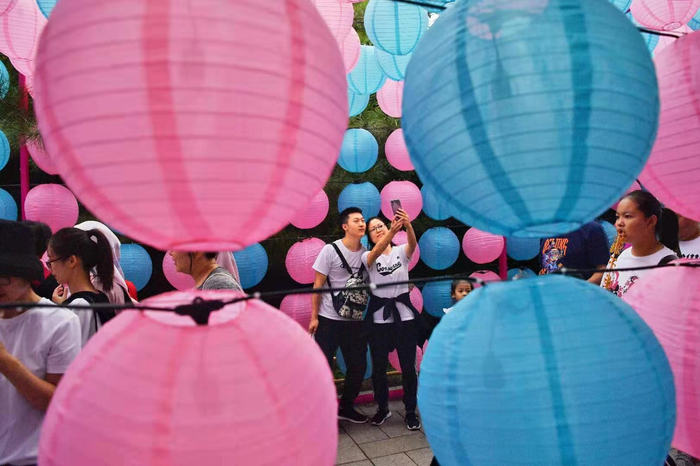 游客在中秋灯廊美景中自拍。摄影/新京报记者 李木易