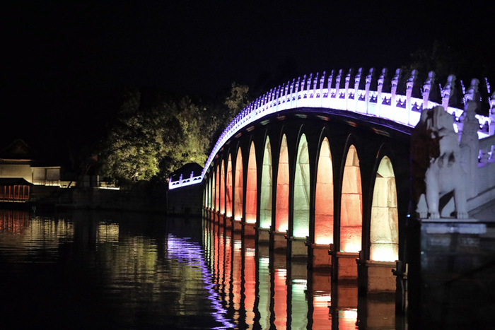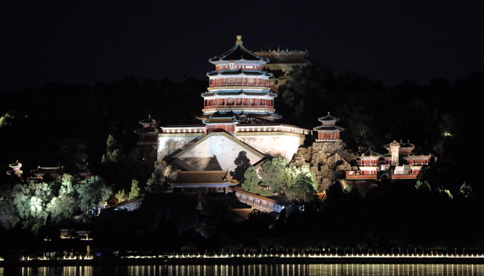 中秋夜,颐和园八方亭至文昌阁开启夜景照明。