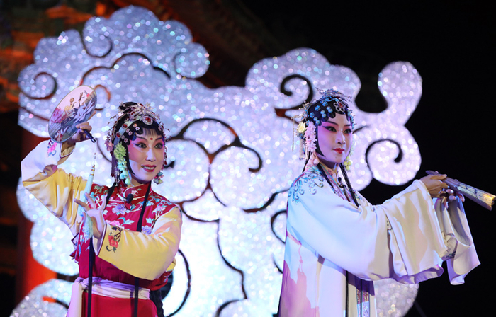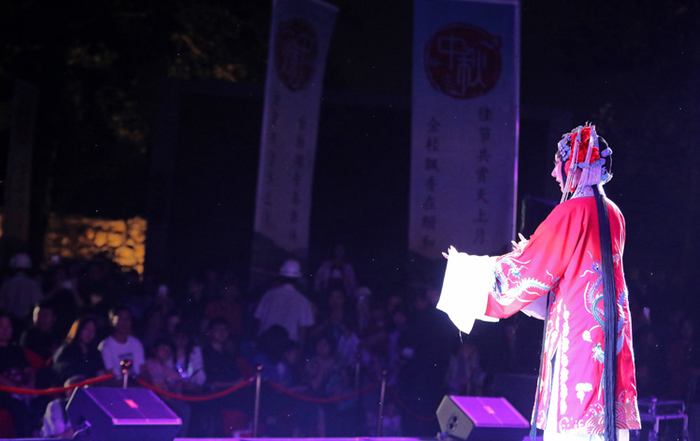 八方亭前,《牡丹亭》、《天女散花》、《十五的月亮》等京剧、昆曲选段轮番开唱。