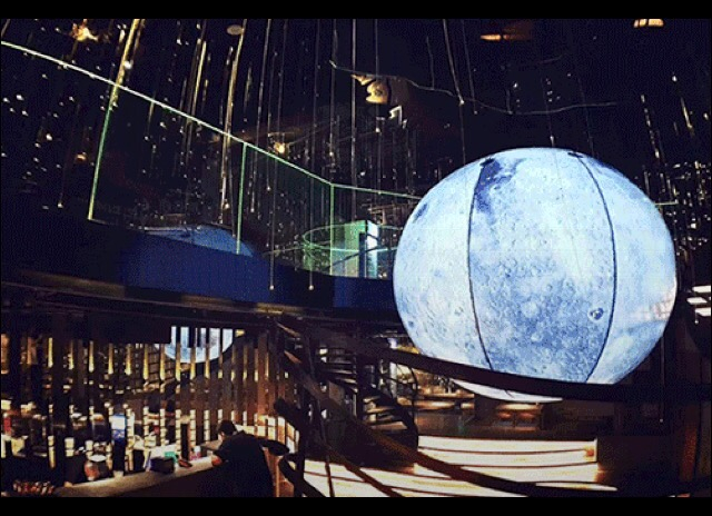 三里屯一家月球主题的网红餐厅。进门以后低垂的夜幕下,漫天星星,中间是3米高的月球。坐在二楼俯视月球,感觉离它特别近。