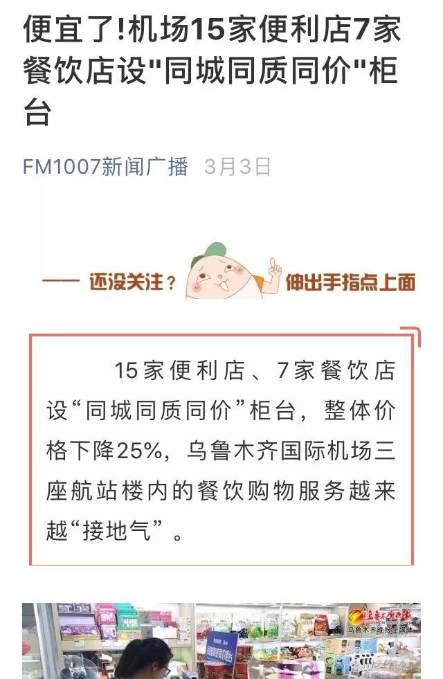今年3月,乌鲁木齐机场宣布,15家便利店、7家餐饮店设“同城同质同价”柜台,整体价格下降25%。2019年计划实现机场航站楼商业区所有商户加入,全面实现“同城同质同价”。
