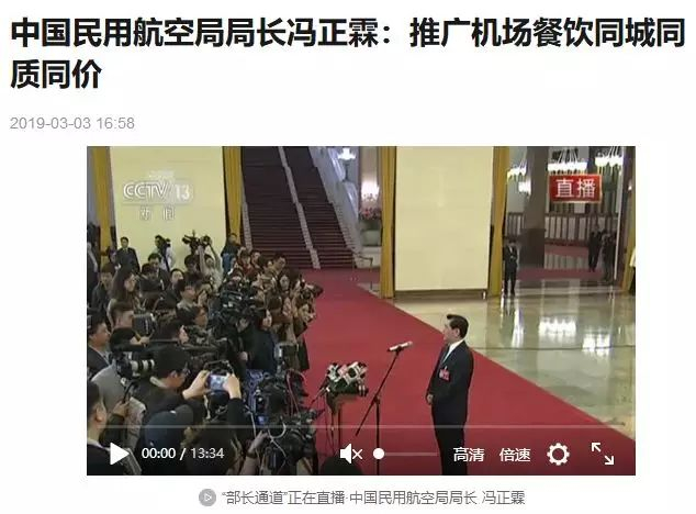 今年3月,两会部长通道上,中国民用航空局局长冯正霖也表示,民航局将进一步改进服务措施,提升服务品质,推进机场餐饮“同城同质同价”。