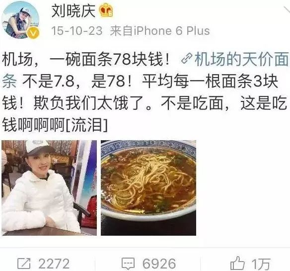 2016年8月,演员刘晓庆在某机场点餐后遇到过价格高达90元的一碗面。此前,岳云鹏、黄晓明等也吐槽过机场吃饭贵。