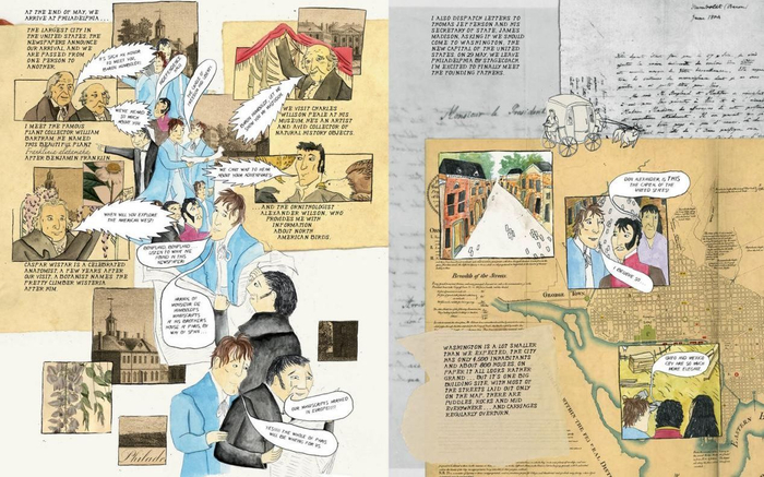 洪堡的新大陆探险在1840年结束,回欧洲之前,他取道美国,去领略这个在新大陆的新生国家,秉承自由主义和启蒙精神所建立的全新国度。他在华盛顿和费城都受到热烈的欢迎。和当时的总统托马斯·杰斐逊、国务卿詹姆斯·麦迪逊等人相谈甚欢。尤其是杰斐逊本人的农业思想和洪堡不谋而合,这让他很开心。