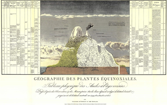对于洪堡本人而言,南美探险之旅当中最珍贵的收获,就是由他亲自绘制的《自然之图》,这是一幅巨型钦博拉索峰剖面图。绘画出于不同海拔高度的动植物种类,而两旁的图表则列出气压、湿度和温度等气候详情。这些资料再与旁边列出的全球多座宏伟山脉作比较。这些交互参照的数据,以图表方式显示自然世界其实就是一个完整而浩瀚的全球系统,这是洪堡学问的特色。图片来源: A. de Humboldt, Essai sur la géographie des plantes (1805), Vème partie