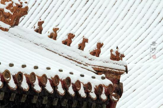 在大雪纷飞的故宫停步驻足,