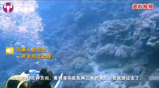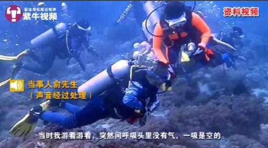 “当时我一边做手势,一边拿自己的气压表给潜导看,想让他知道是气源被切断,但是潜导第一反应是拿出我的备用呼吸头塞到我嘴里。”然而由于气瓶被关,备用呼吸头里没有充气,俞先生猛吸一口直接呛到了海水,他连忙拿开嘴里的备用呼吸头,又连呛了几口海水。潜导见状,直接用自己的备用呼吸头塞进俞先生嘴里,这才让他重新吸到氧气。