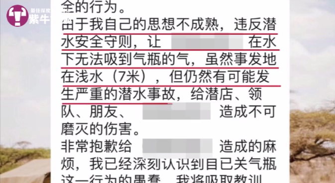 紫牛新闻记者了解到,“T仔”本名姓刘,自称拥有较为专业的潜水组织GUE(全球水下探险家)证书。事件发酵后,他也在朋友圈做出道歉。“在pg关了两个朋友的气瓶,做出非常不安全的行为,给这两个朋友道歉,真的对不起你们。”在另一个潜水群中,他承认自己违反了潜水安全守则,让别人在水下无法呼吸到气瓶的气,可能引发严重的潜水事故。“我已经深刻认识到自己关气瓶这一行为的愚蠢,我将吸取教训,在以后的潜水中严格遵守安全守则。”