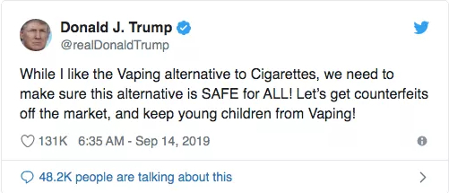 美国总统特朗普14日在推特上说:“我喜欢电子烟作为香烟的替代品,但我们必须确保它对所有人都是安全的!让我们扫除市面上的仿冒品,让青少年远离电子烟。”
