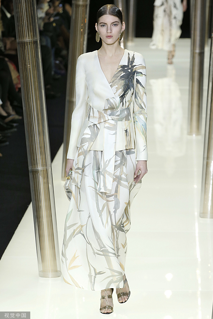 如果说,早期国际品牌设计师更青睐龙、凤等图案造型,如今越来越多的设计师已经开始尝试更多的文化符号。在以中国风为灵感的阿玛尼高定(Armani Prive)大秀上,就曾以“竹”元素为整场的核心设计灵感。无论是丝绸上的图案、抑或是薄纱上的钉珠,都以中国文人画中“墨竹”的写意笔法来表现,就连秀场布置,也是一片曲径通幽的竹林。或因中西方的文化差异,许多西方设计师在引用中国元素时,有时候会给人一种“用力过猛”的感觉。而2015年阿玛尼的设计,则以竹子清洁素雅的气质,呈现出其亭亭玉立的潇洒风度,契合了中国文人所崇尚的“中通外直、虚怀若谷”的修竹秉性。