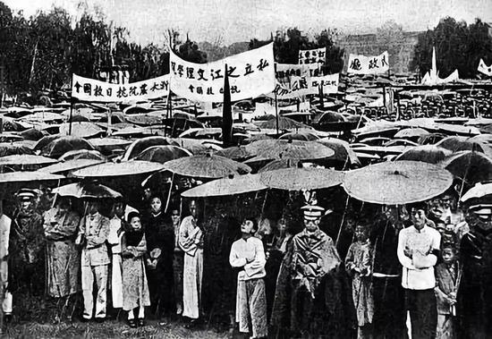 九一八事变后,杭州市各界群众举行抗日救国大会。