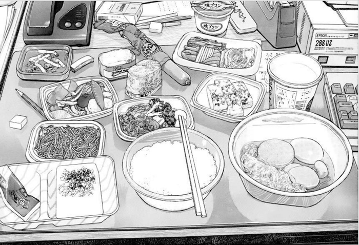 这便是《孤独的美食家》重复至今的惯用桥段。身处20世纪90年代的五郎,和同时代的大多数都市人一样共享着相似的生活方式,例如对外食的依赖。作品中从来没有呈现出五郎自宅的样子,无从获悉他本人是否有自炊的情况。甚至连超市熟食、便利店的便当之类的快餐也绝少提到。