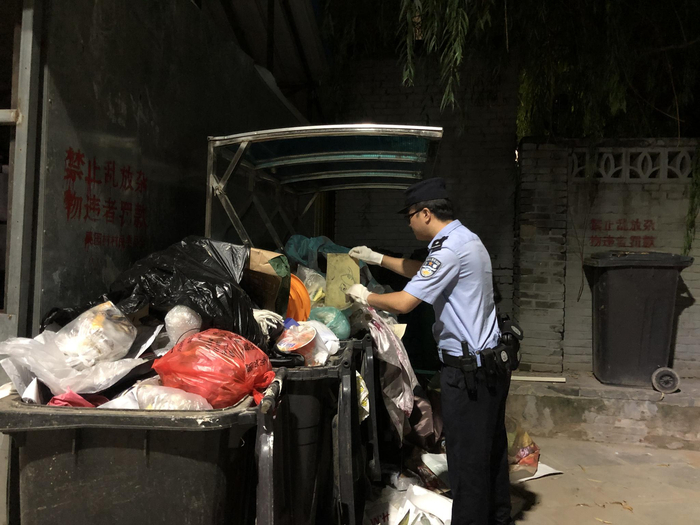 民警在垃圾桶内翻找相关线索。警方供图