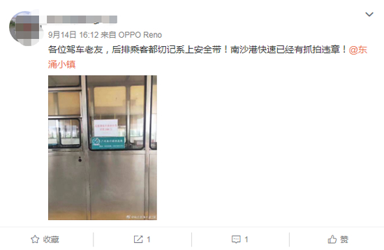 “各位驾车老友,后排乘客都切记系上安全带 !南沙港快速已经有抓拍违章!”