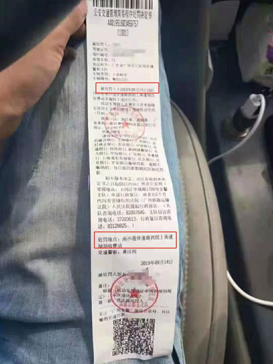 从街坊提供的罚单可以看到,时间是2019年9月14日,司机在南沙港快速路西侧上高速细沥收费站被罚款200元,原因是因为乘客坐后排没有系安全带。