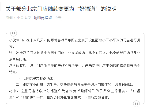 根据更名说明,“鲍师傅”未来几天将对早年间在北京开设的、面积小于40平方米的门店进行调整,涉及北京西安门店、华威店、东四店、新街口店、阜成门店。