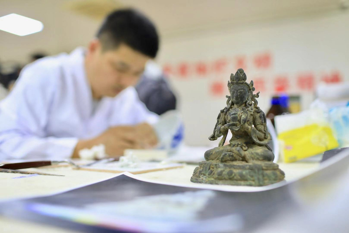 待修复的地天母铜佛像。摄/新京报记者 浦峰