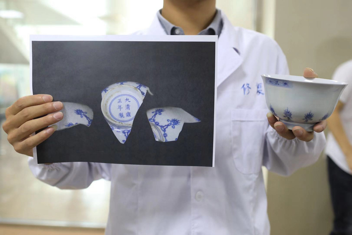 修复人员展示正在修复的雍正青花碗。摄/新京报记者 浦峰