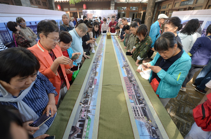“这儿,这儿,这不我家那胡同儿吗,这报刊亭,孩子小时候我就跟这儿给他买画报,也不知道他还记不记得,这我都要拍下来发给他。”“以前坐24路公交车上下班,天天打这儿过,但过去没工夫留意,现在这一看,那会儿街边还真是热闹。”街坊们围着卷轴你一言我一语闲聊,边看边用手机拍,之前认识或者不认识的人都曾因住过南小街熟悉起来。