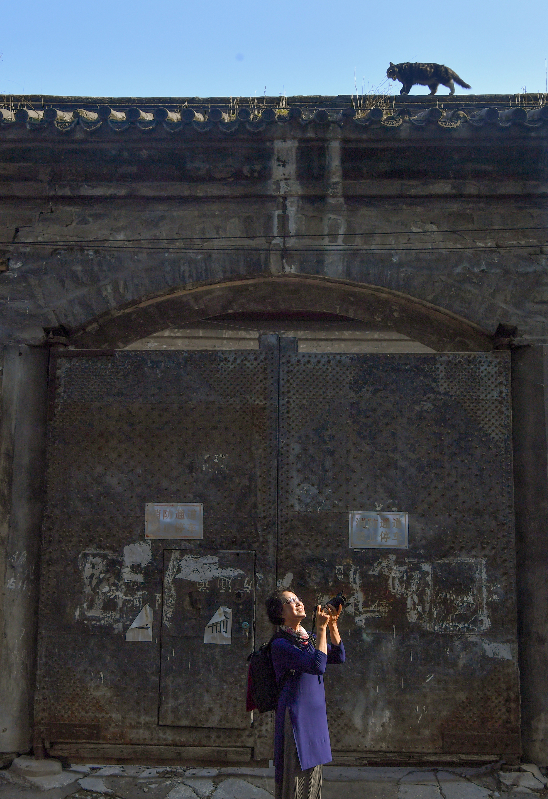 新京报记者跟着吴强在胡同里边走边聊,院墙上一只优哉游哉的猫吸引了她的镜头。“您这儿拍什么呢?”一位身材高大的膀爷朝吴强打招呼,“就您对面儿那院儿,九爷府,清朝的王爷府。不过现在不对外开放了,您想看可以去恭亲王府逛逛。”