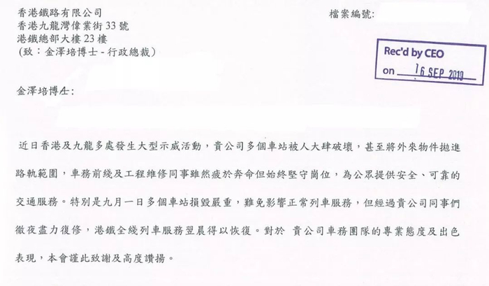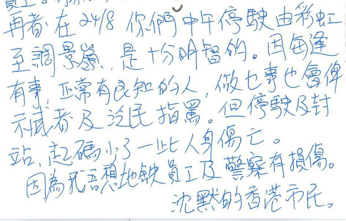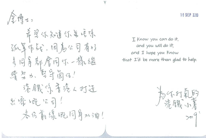 “希望你知道你并不是孤军作战。港铁是香港人打造出来的!公司各位前线的同事加油!”