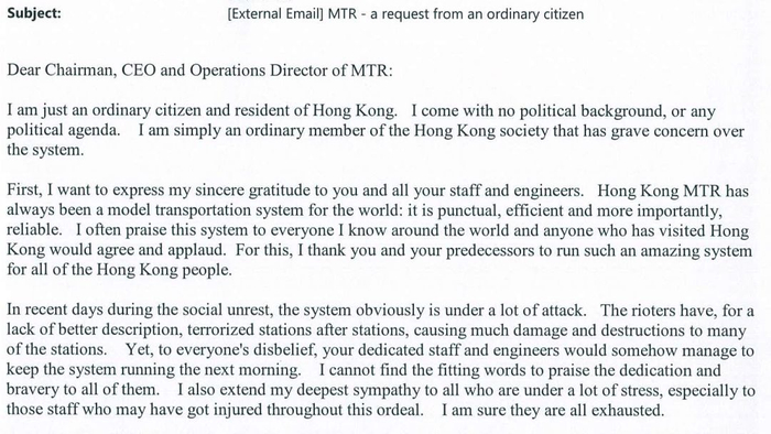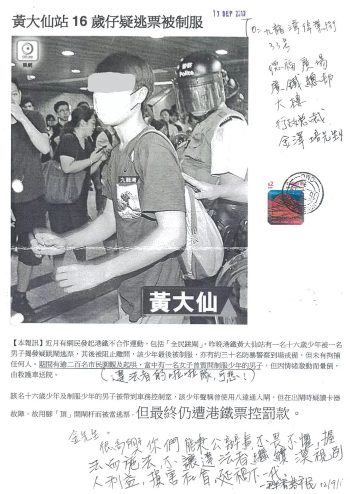 文末附上金泽培先生独家提供给侠客岛的市民支持港铁的来信。
