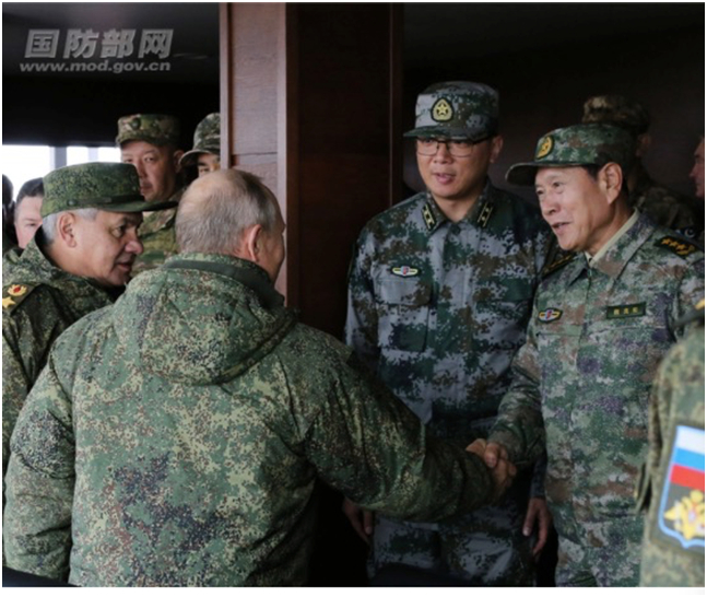 中国防长魏凤和着新式迷彩服亮相观摩俄军演