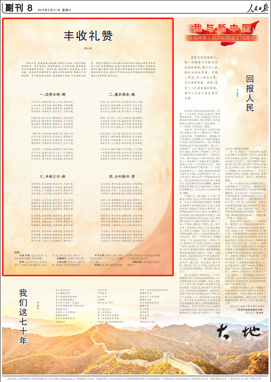 9月21日的《人民日报》副刊8版,刊发了农业农村部党组书记、部长韩长赋写的长篇四言诗《丰收礼赞》。