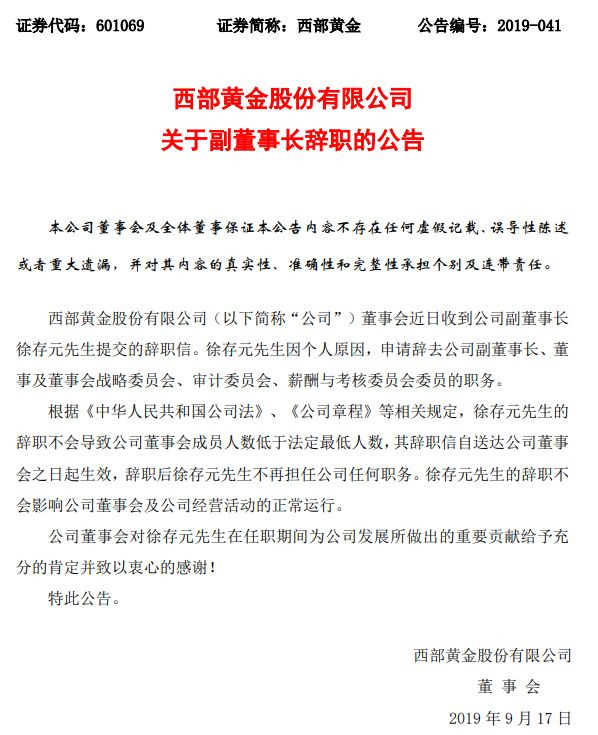 值得一提的是,9月17日,西部黄金股份有限公司董事会发布公告称,西部黄金股份有限公司董事会近日收到公司副董事长徐存元先生提交的辞职信。徐存元先生因个人原因,申请辞去公司副董事长、董事及董事会战略委员会、审计委员会、薪酬与考核委员会委员的职务。