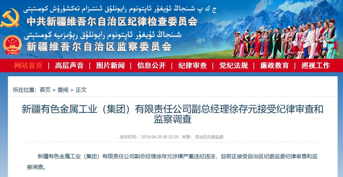 据新疆维吾尔自治区纪委监委网站9月20日消息,新疆有色金属工业(集团)有限责任公司副总经理徐存元涉嫌严重违纪违法,目前正接受自治区纪委监委纪律审查和监察调查。